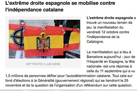 Le Monde se hace eco hoy de la concentración españolista de Barcelona en el bloque 'Droite (s) extreme (s)' y titula que "la extrema derecha española se manifiesta contra el independentismo catalán '. Los autores del artículo apuntan que la extrema derecha española ha aprovechado la concentración de hoy para volver a salir a la calle, y menciona concretamente la Falange, el MRS y Plataforma per Catalunya. Recuerdan que la derecha española siempre ha sido contraria a la independencia de cualquier territorio y que justamente este es el eje de la campaña electoral del PP de cara al 25 de noviembre.