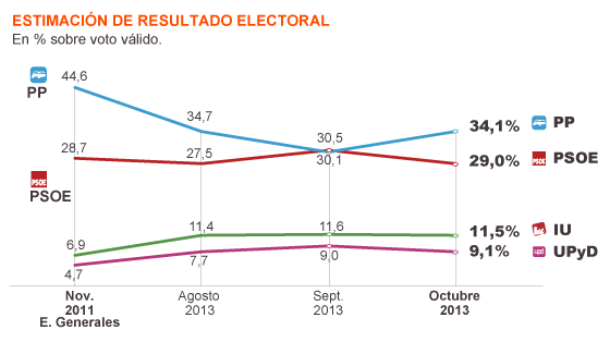 La mitad de la dura legislatura dejaría al PP con un notable desgaste cifrado en diez puntos menos que el histórico resultado que lograron en las generales del 20 de noviembre de 2011, con una estimación de voto del 34,1%. Al PSOE, los casi dos años en la oposición le dejan prácticamente atascado en el peor resultado electoral de su historia (el 28,7% de 2011), y con unos datos de valoración muy negativos de su actual líder, Alfredo Pérez Rubalcaba.