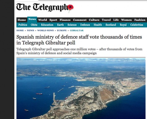 El diario The Telegraph ha pillado el Ministerio de Defensa español votante miles de veces en una encuesta digital sobre la soberanía de Gibraltar. La encuesta, que preguntaba si Gibraltar es británico o español, se aproxima al millón de votos después de que los funcionarios del ministerio se hayan dedicado a votar en masa a favor de la soberanía española del Peñón.