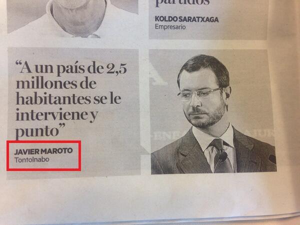 El alcalde de Vitoria, el popular Javier Maroto, aseguró ayer qye la UE vetaría una Euskadi independiente y que los pequeños países tienen menos peso político. “A un país de 2,5 millones de habitantes se le interviene y punto”, señaló. Las declaraciones han sido recogidas en la edición de hoy de Noticias de Guipuzcoa con un pie de foto junto a Maroto en el que en lugar del cargo aparece escrito “tontolnabo”. La pifia está siendo difundida por las redes con gran revuelo por ejemplo a través de @DiarioFatxo.