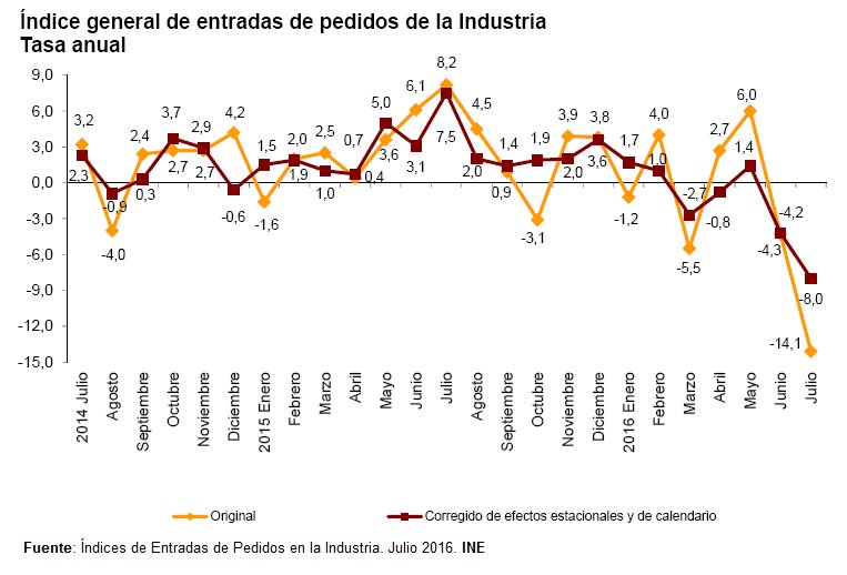Índice general de entradas de pedidos en la industria. Julio 2016. Tasa anual: -8,0% serie desestacionalizada; -14,1% serie original #INE