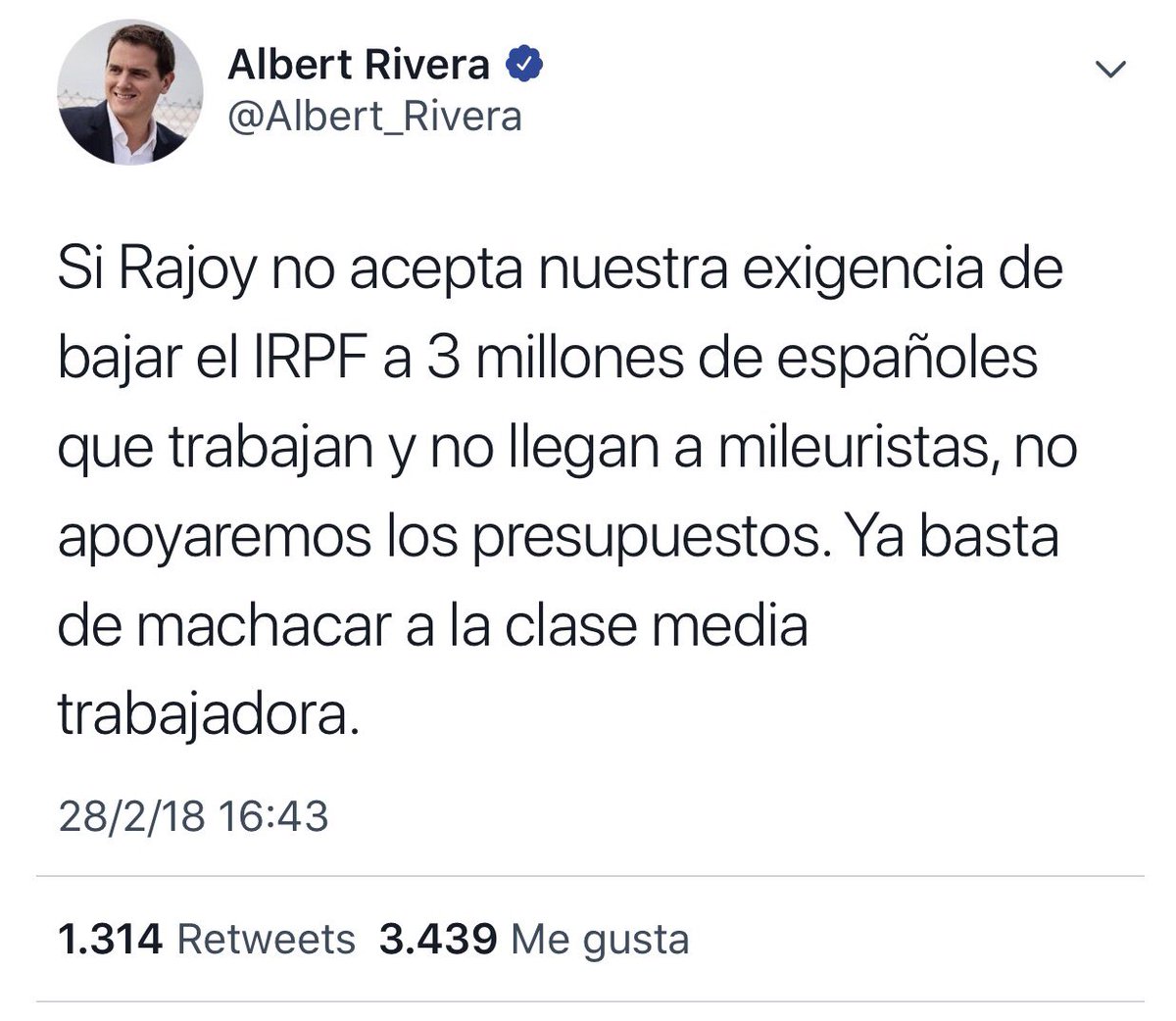 Si Rajoy no acepta nuestra exigencia de bajar el IRPF a 3 millones de españoles que trabajan y no llegan a mileuristas, no apoyaremos los presupuestos. Ya basta de machacar a la clase media trabajadora.— Albert Rivera (@Albert_Rivera) 28 de febrero de 2018
