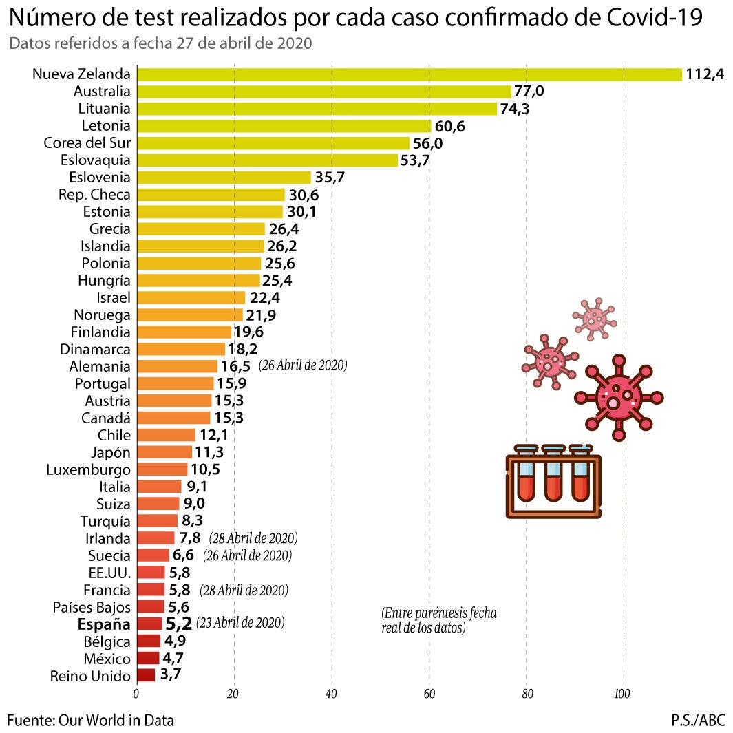 El Gobierno ha tratado esta semana de sacar pecho por la cantidad de test de coronavirus realizados, saliendo al paso de las críticas por su escasez. Primero destacó que España era octava en el ranking de la OCDE en test por cada mil habitantes –aunque tras la revisión de los datos quedó relegada al número 17– y luego el presidente del Ejecutivo, Pedro Sánchez, añadió que se situaba como quinta del mundo en número total de pruebas, según un supuesto estudio de la Universidad Johns Hopkins que, como informó este viernes ABC, hasta ahora no ha aparecido.