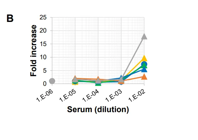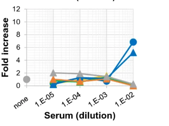 At 175 days post-vaccination, our unfortunate volunteer HC2 was no longer the only one whose serum seemed to enhance viral replication. Another volunteer, HC4, had suddenly joined him:Note that the pattern has changed. Closer to vaccination, there was a window of dilution where ADE occurred. At very low serum concentrations, you might as well have unvaccinated serum; at high concentrations, the antibodies neutralised the virus. Only in the middle did the sera enhance infection. Very far out from vaccination, that’s no longer the case. Now, it’s the highest serum concentrations where ADE happens.All of this is to some degree ancient history; wild-type SARS-2 is dead. How do the vaccine-elicited antibodies fare against Omicron? Of their six volunteers, one – HC6, in grey – had serum that clearly enhanced Omicron replication at high concentration: