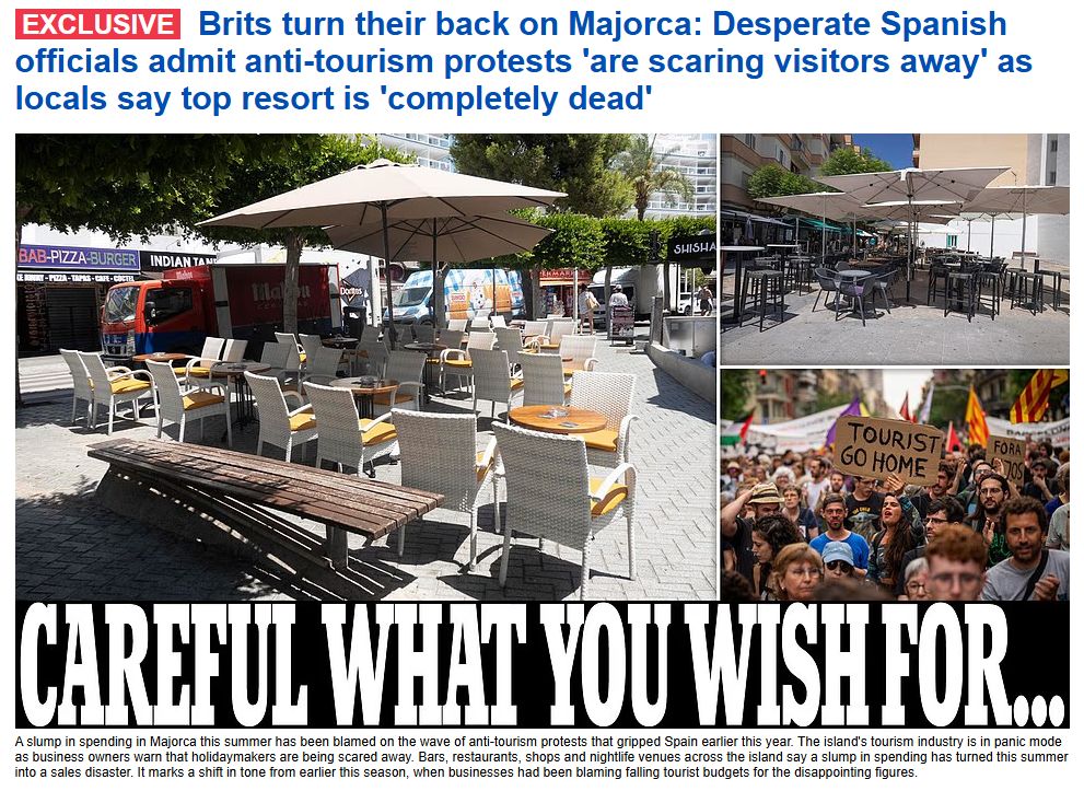 Brits turn their back on Majorca: Desperate Spanish officials admit anti-tourism protests 'are scaring visitors away' as locals say top resort is 'completely dead'